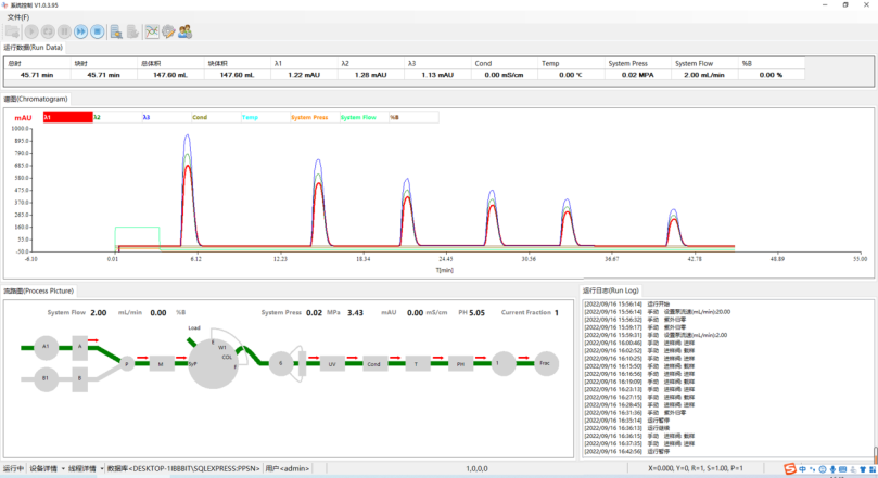 系统控制模块用于启动、查看和控制方法运行。该模块由三个窗格组成,提供运行状态的总览。运行数据窗格以数值形式显示当前数据,而层析图谱窗格在整个方法运行过程中以曲线形式显示数据。流程图窗格实时显示运行期间的流路和运行状态,可用于控制运行(图 7)。